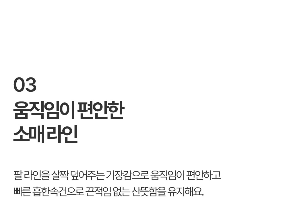 땀 걱정 없이 몸에 감기는 느낌이 적고 운동후에도 쾌적하게!