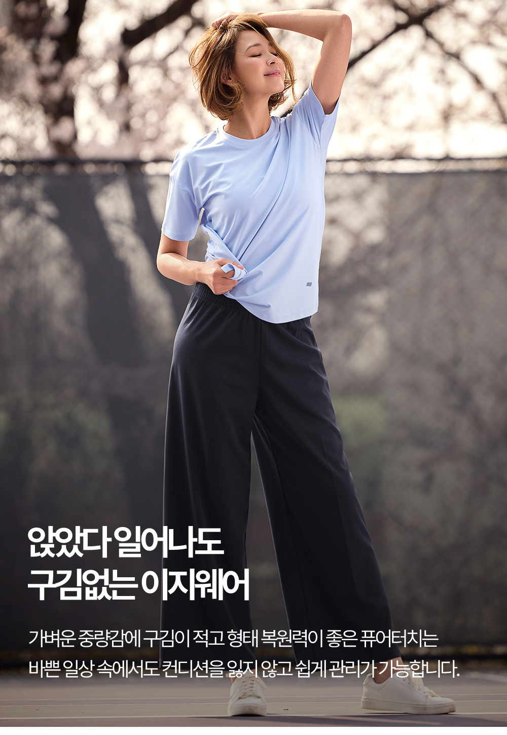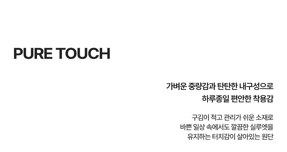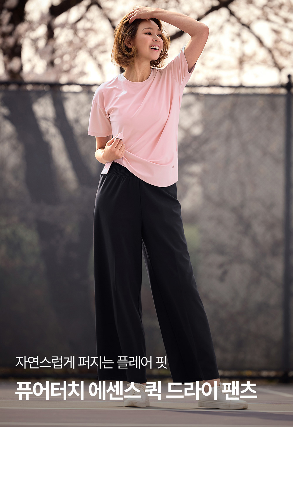 퓨어터치 에센스 퀵드라이 키작아도 괜찮아 팬츠가벼운 중량감과 퀵드라이 기능으로 쾌적하게 착용할 수 있는 플레어핏 이지웨어 팬츠입니다. 코메즈 밴딩으로 편안한 착용감을 제공하며 키가 작은 분들도 부담 없이 입기 좋은 핏으로 제작되었습니다. 제품 정보 더보기어떤 상황에서 입기 좋은가요